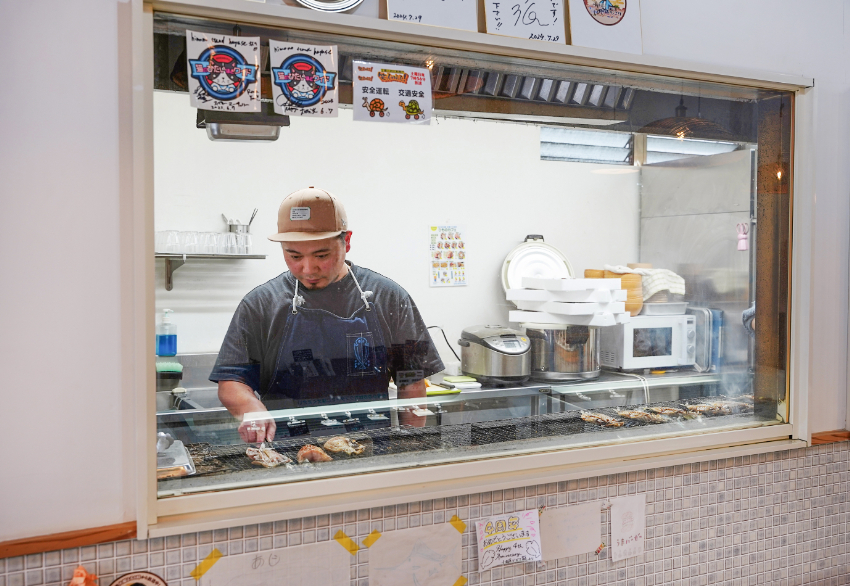 店に足を踏み入れると、炭火で焼かれる干物の香ばしい匂いがふわりと漂う。ここでは、店内で丁寧に焼き上げた干物を、ご飯の上に大胆にのせた弁当をはじめ、干物を主役にしたフィッシュバーガーなどを提供。