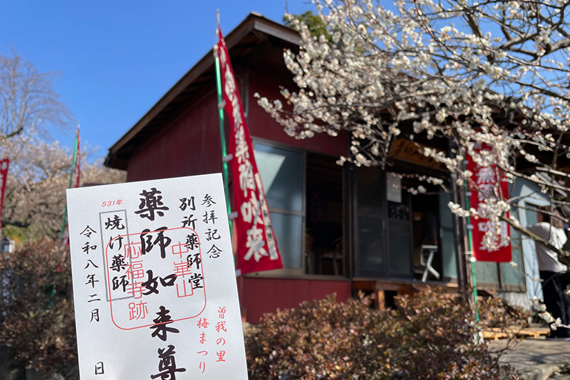 満江御前の墓の近くにある「別所薬師堂」は、一見、集会所かなと思えるようなトタン屋根の建物に、薬師如来像が安置されています。梅まつり期間の限定日に一般公開しているそうで、運よく拝観することができました。戦国時代に兵火をこうむって背が焦げてしまったことから、別名「やけ薬師」とも呼ばれているそうですが、表情は柔らかく品の良い立ち姿。奈良時代の僧である行基菩薩の作といわれ、周囲には勇ましい姿の脇侍十二神将(作者・年代不明)がまつられていました。