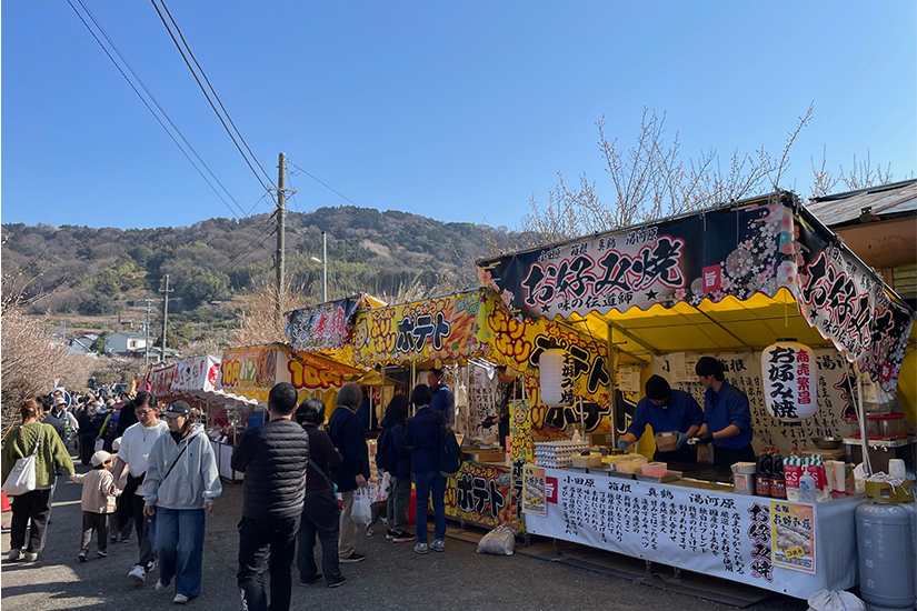 その開花に合わせて約1か月間行われる「小田原梅まつり」。普段はのどかなエリアですが、梅まつり期間中は屋台や獅子舞なども登場して、にぎやかな空間に一変します。