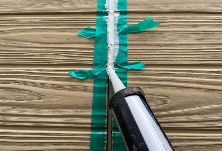 コーキング材を充填します。塗りつぶし色で外壁を塗装する場合、コーキングを施工