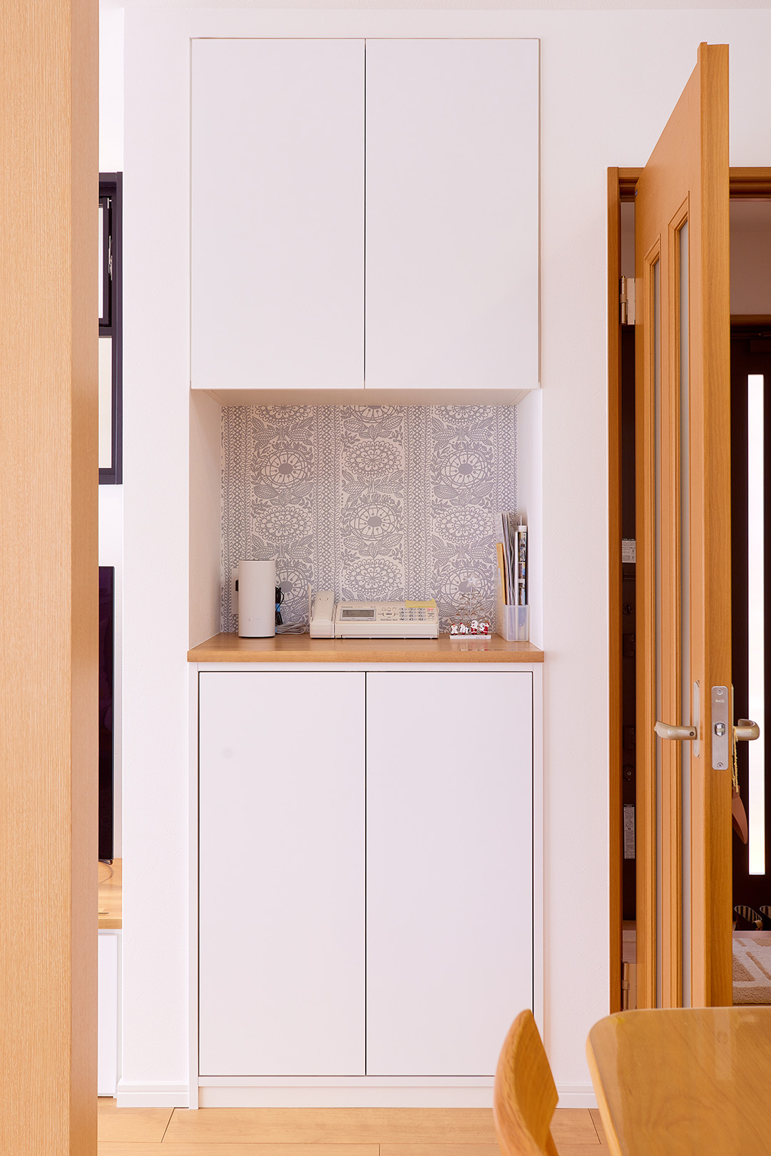 内部には柄物のクロスをお選びいただきとてもおしゃれな収納になりました