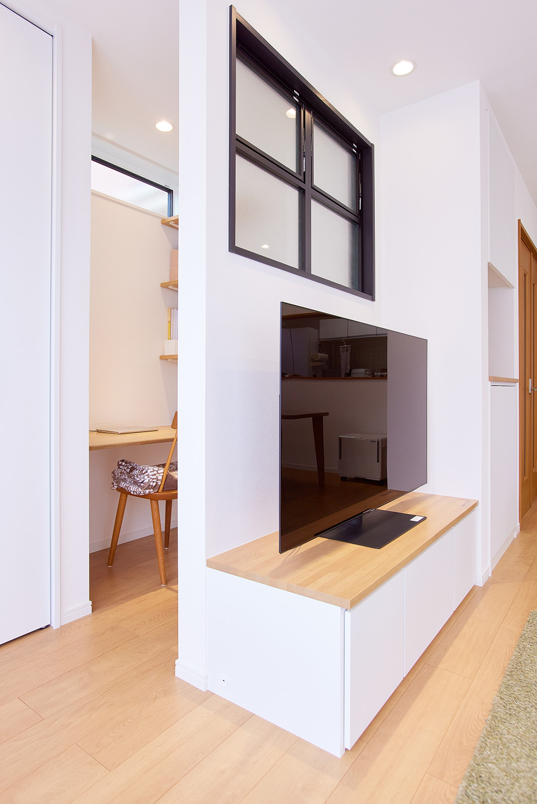 テレビの上には内窓、後ろにはコンパクトなスタディスペースを設置