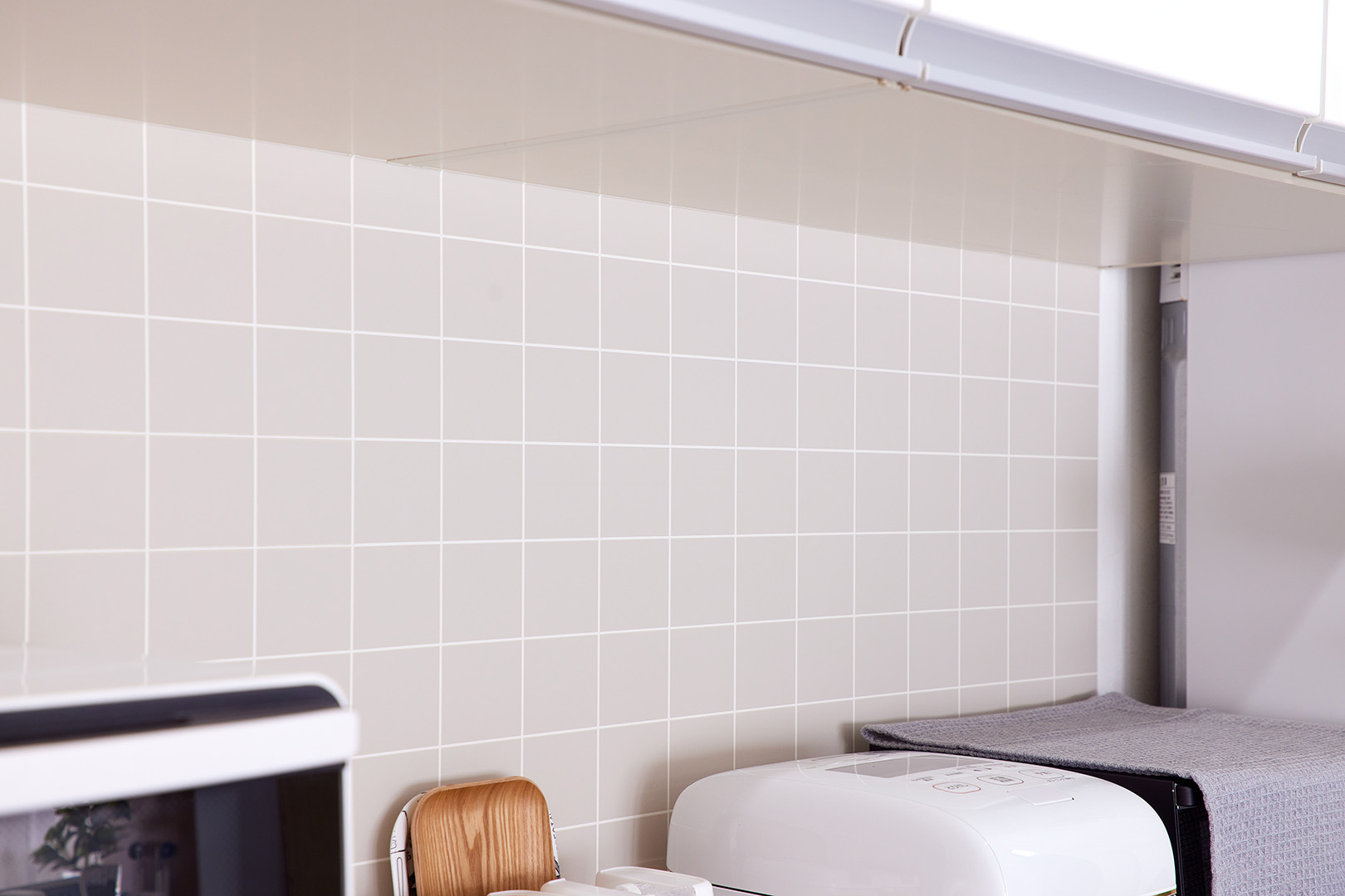 カップボードの間はタイル調のクロスに