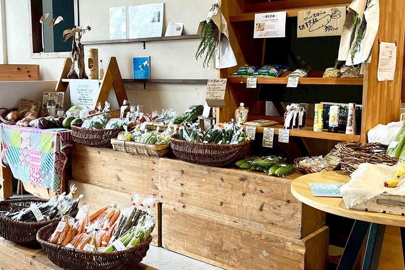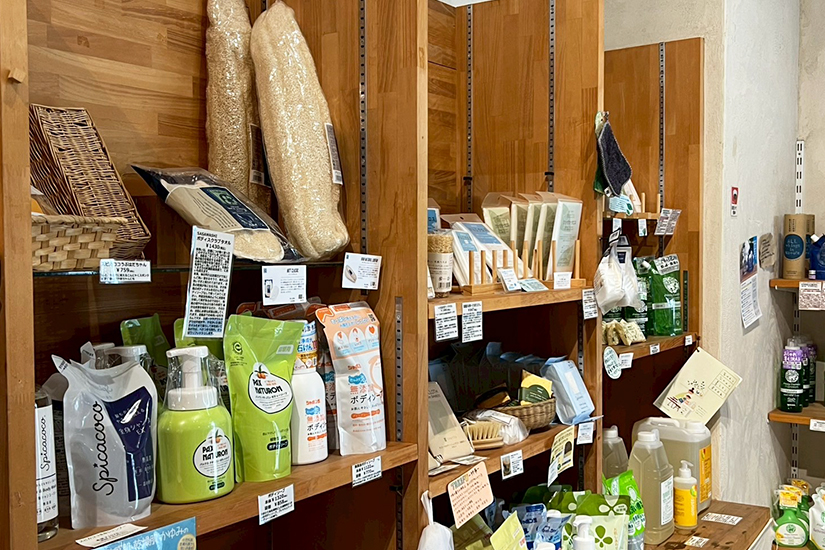 選び抜かれた多彩なエコ製品はスタッフやお客様の要望を取り入れ定期的に更新。自分に合った物を探すのも楽しみ。採れたて有機野菜「ふじさわやさい」コーナーも人気です。
